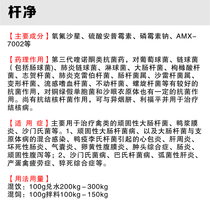 【主要成分】氧氟沙星20%、硫酸安普霉素、磷霉素钠、AMX-7002等