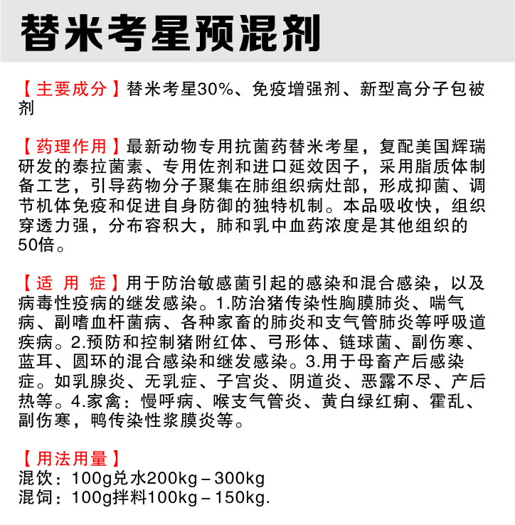 组方成分:替米考星30%、免疫增强剂、新型高分子包被剂推荐理由: