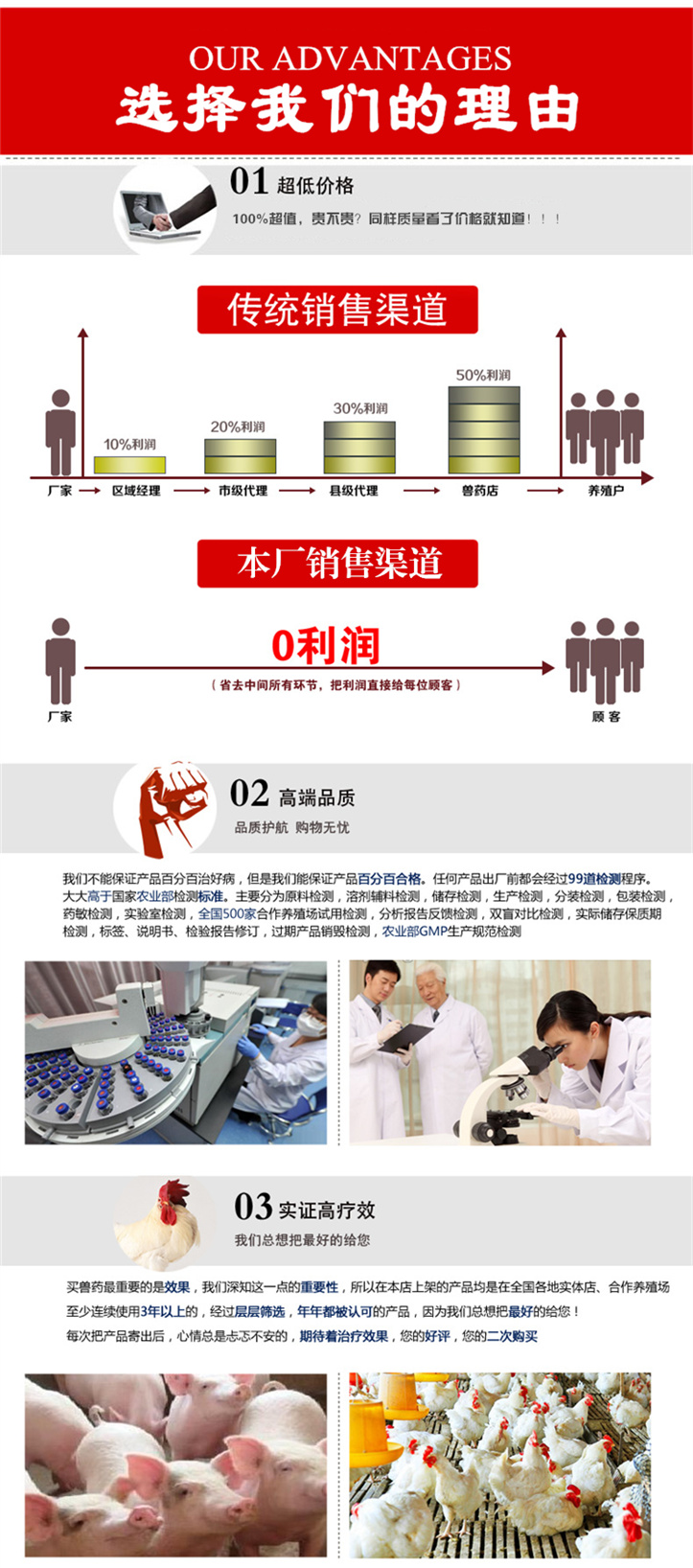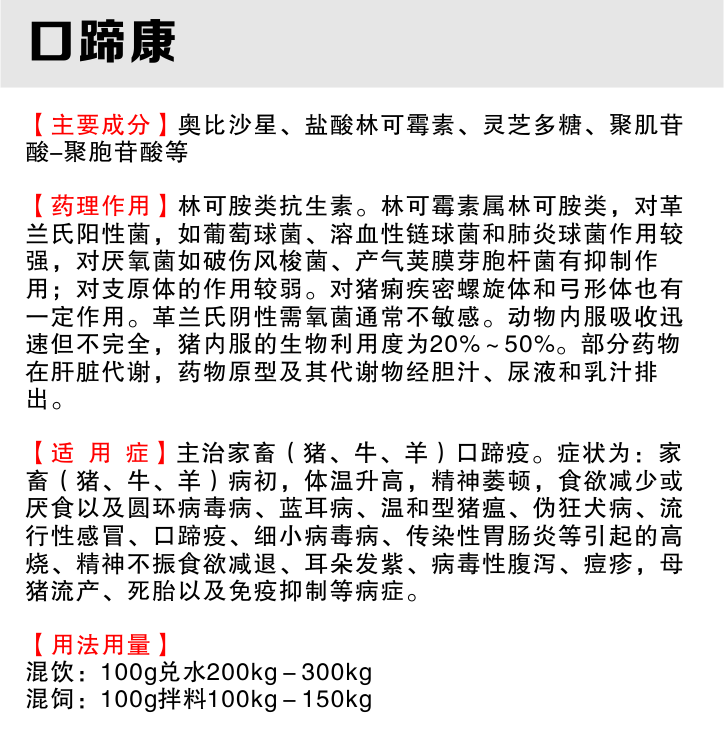 【药物作用】本品具有强烈的抗菌、抗病毒功能和强烈的消炎(抗渗出、抗溃疡、抗过敏)功能,能够抑制或杀灭病源微生物,能够消除口蹄起泡、发热、疼痛等临床症状;同时,本品还具有保护免疫系统、提高机体免疫力、保肝利胆等功能,能够促进畜禽机体进行解毒和排毒,促进新产代谢,从而促进畜禽康复。