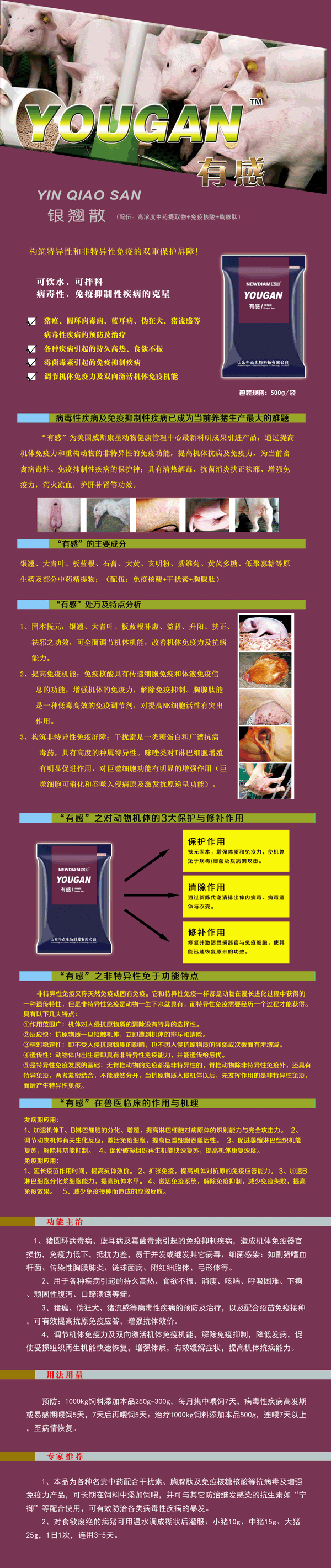 银翘、大青叶、板蓝根、石膏、大黄、玄明粉、紫维菊、黄氏多糖、低聚寡糖等原生药及部分中药精提物:(配伍:免疫核酸+干扰素+胸腺肽)